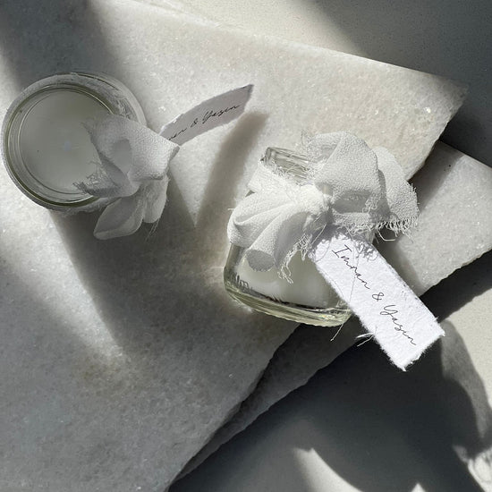Kerzen im Glas, personalisiert mit handgemachten Baumwolletiketten