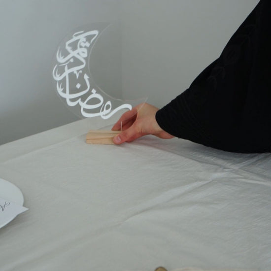 Mond Deko Aufsteller mit dem Schriftzug "Ramadan Kareem" auf arabisch mit Holzsockel.