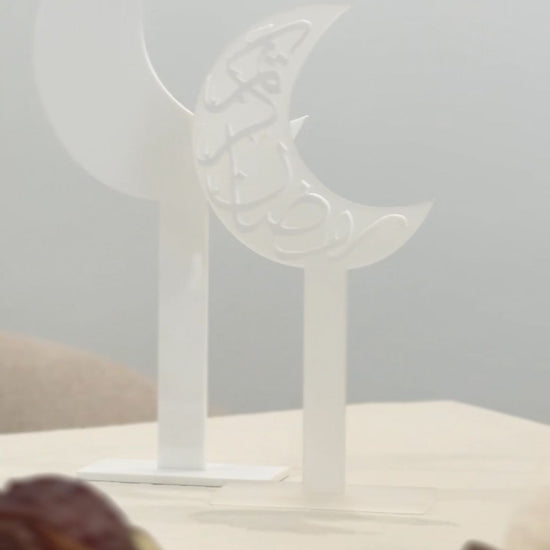 dekorative Mond Aufsteller in weiß und satiniertem Acrylglas mit dem Schriftzug "Ramadan Kareem" auf arabisch.